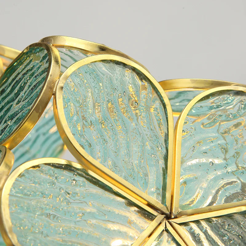 Ta lampa wisząca to prawdziwe dzieło sztuki, które łączy w sobie kunszt rękodzieła i elegancję dekoracyjnego oświetlenia. Jej klosz został wykonany z kolorowych elementów szkła, osadzonych w złotej ramie, które układają się w formę przypominającą kwiatowe płatki lub organiczne struktury natury. Każdy segment szklany subtelnie rozprasza światło, tworząc wyjątkową grę barw i refleksów, nadając wnętrzu ciepły, artystyczny klimat.