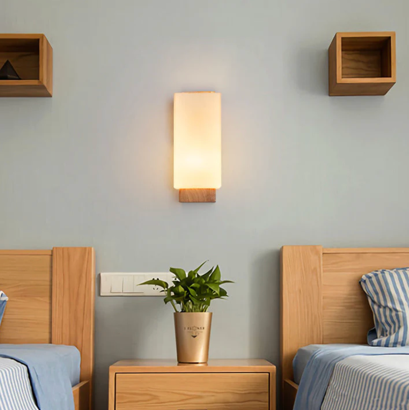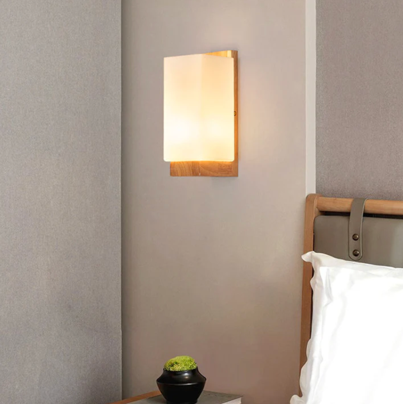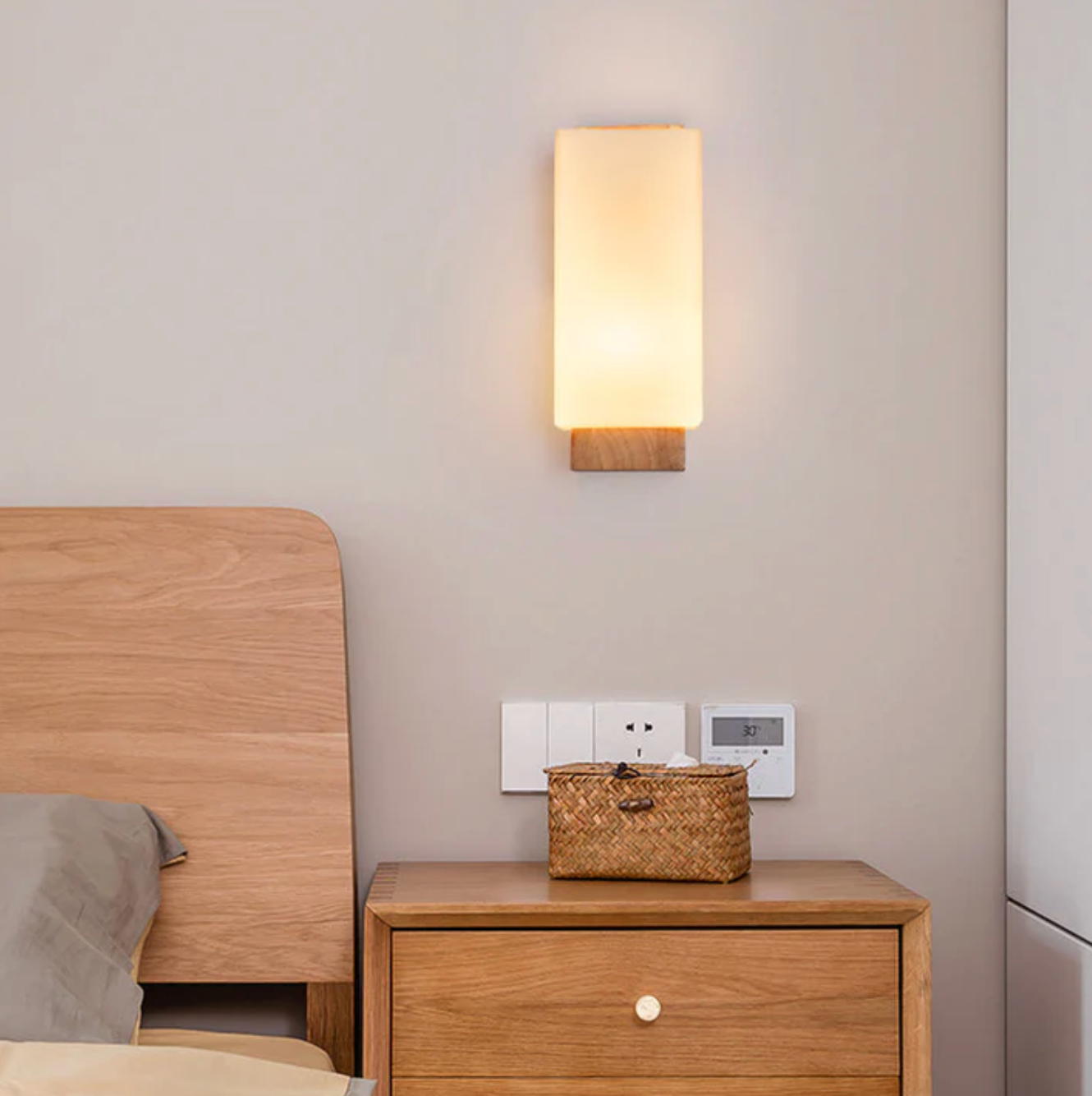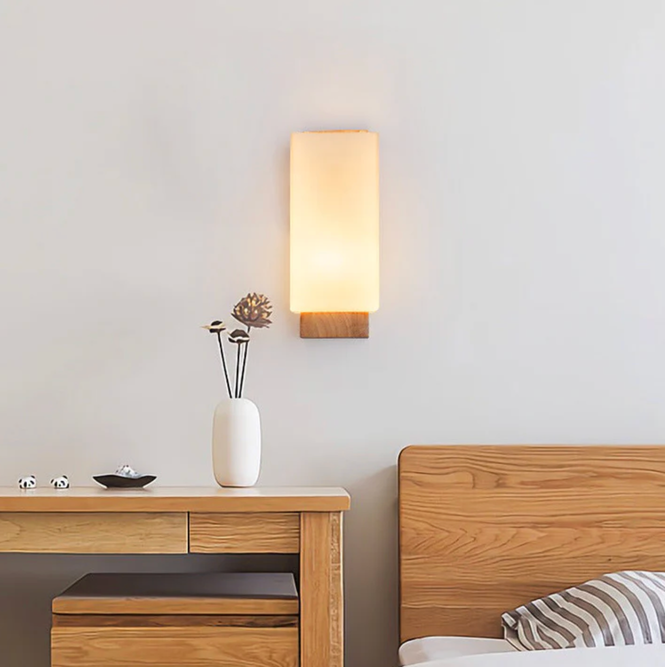 Kinkiet ścienny drewniany z mlecznym kloszem – nowoczesna lampa do sypialni