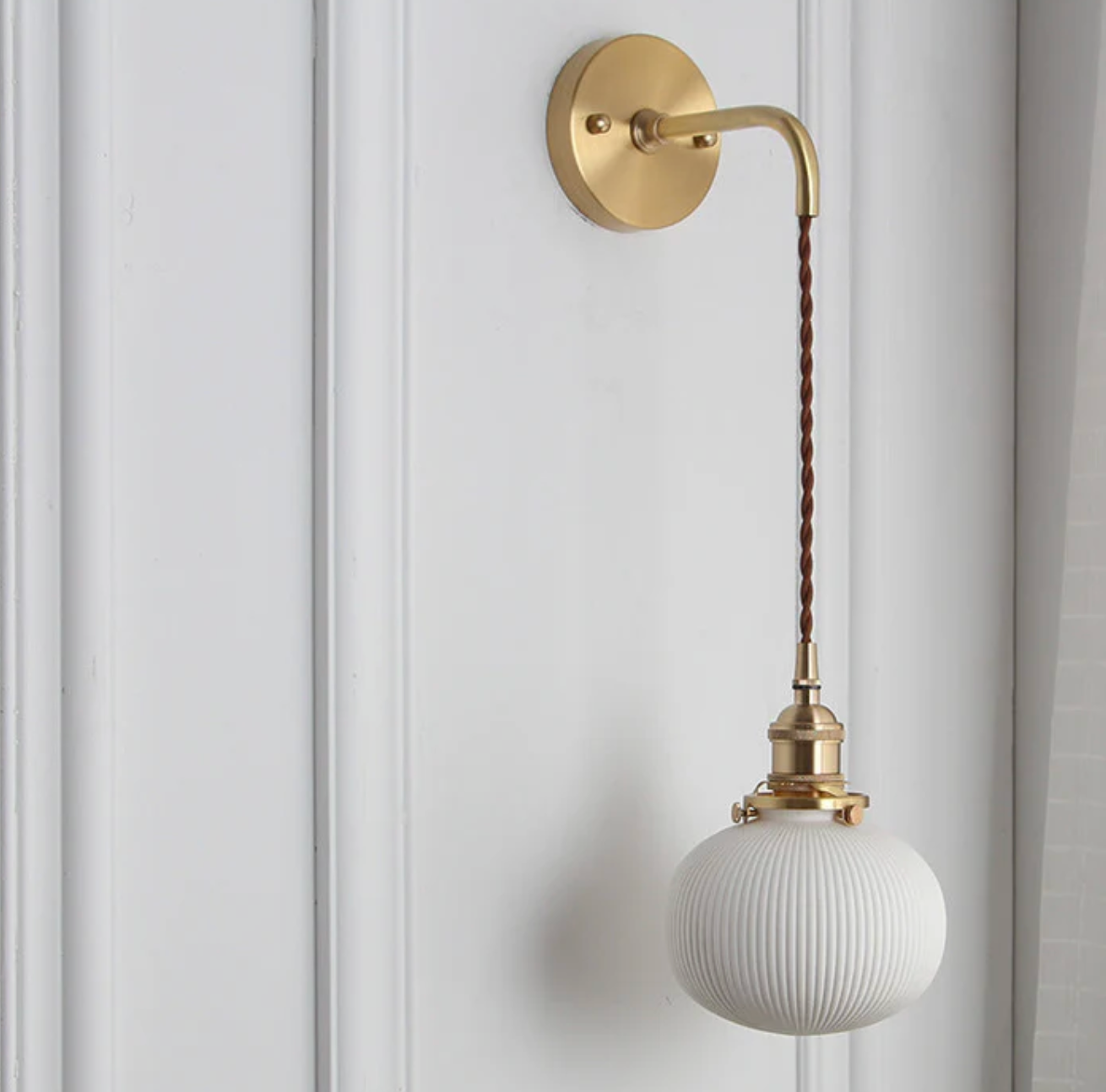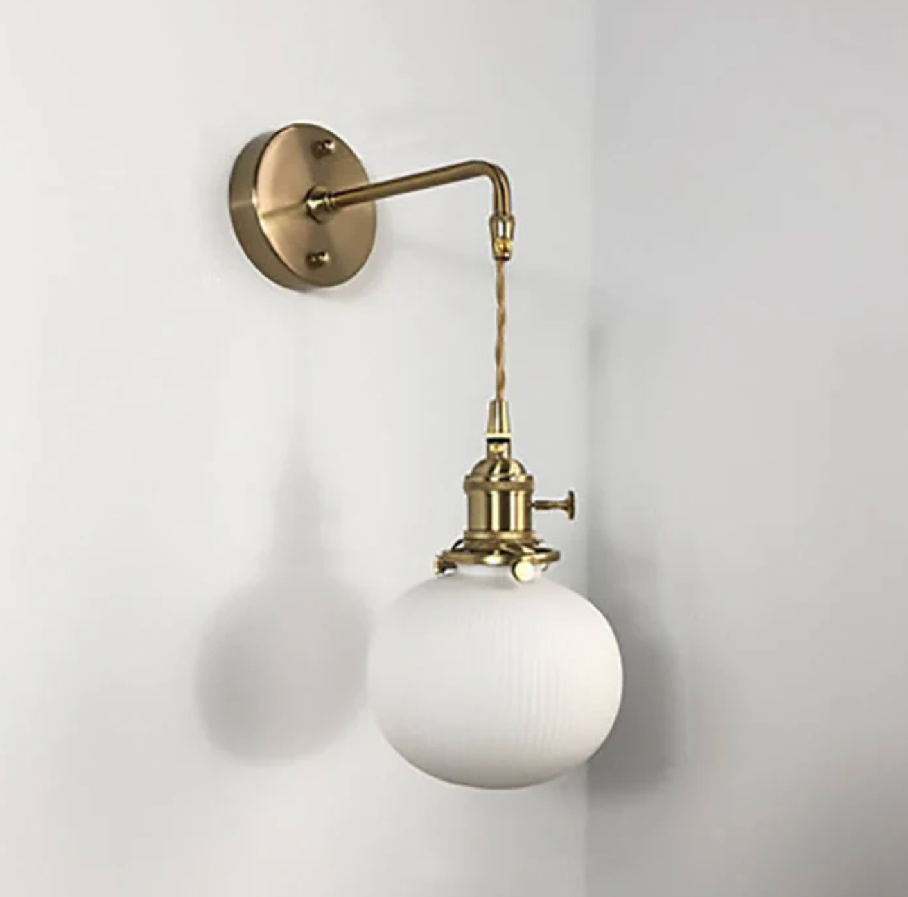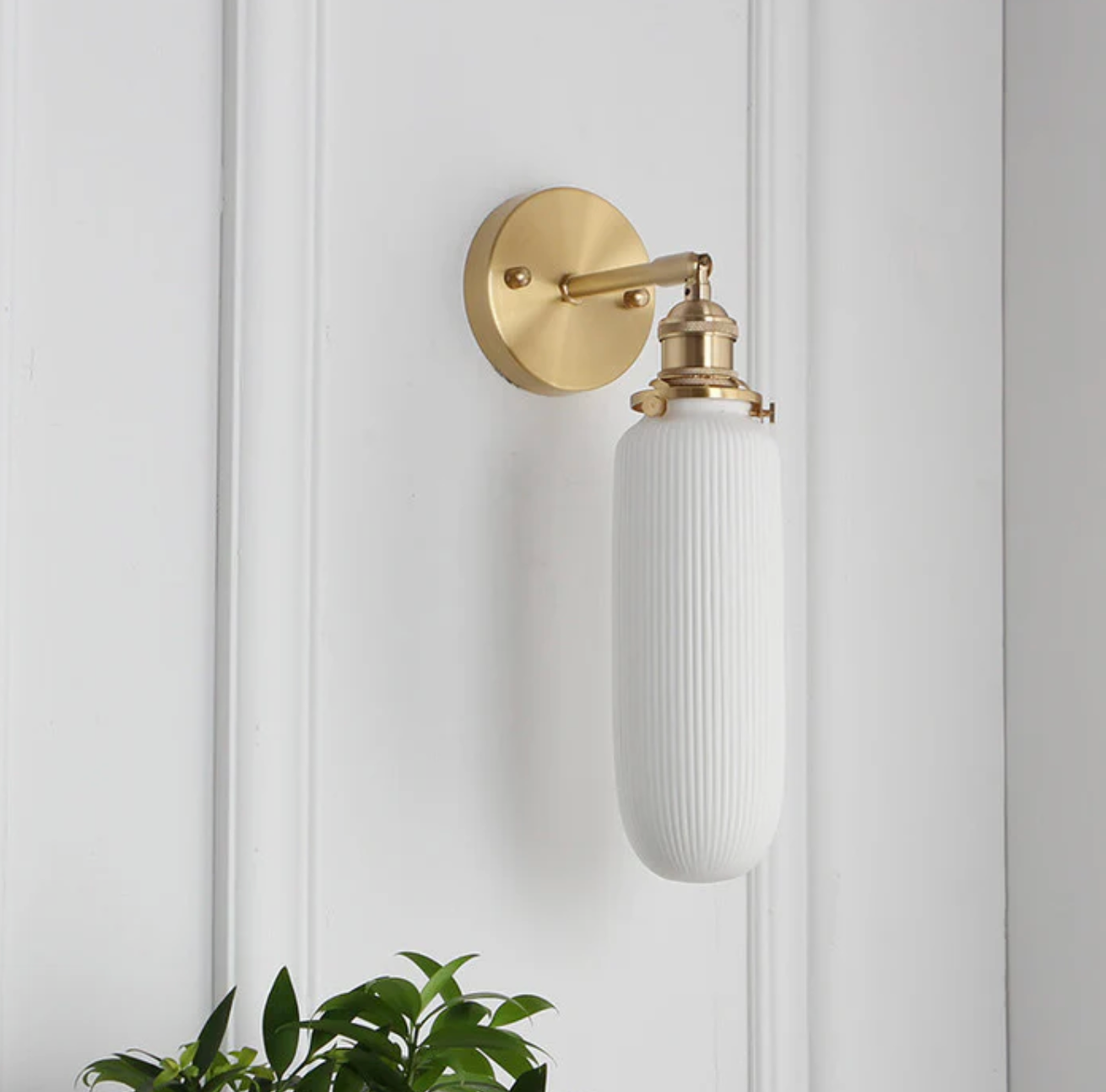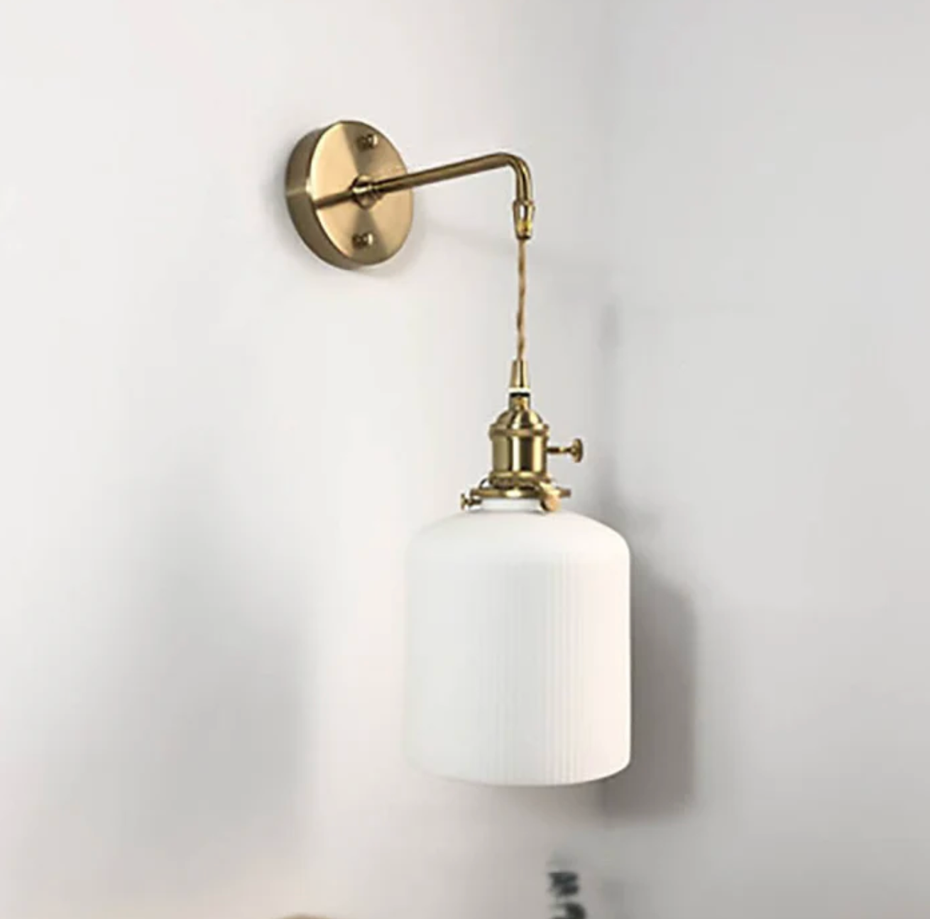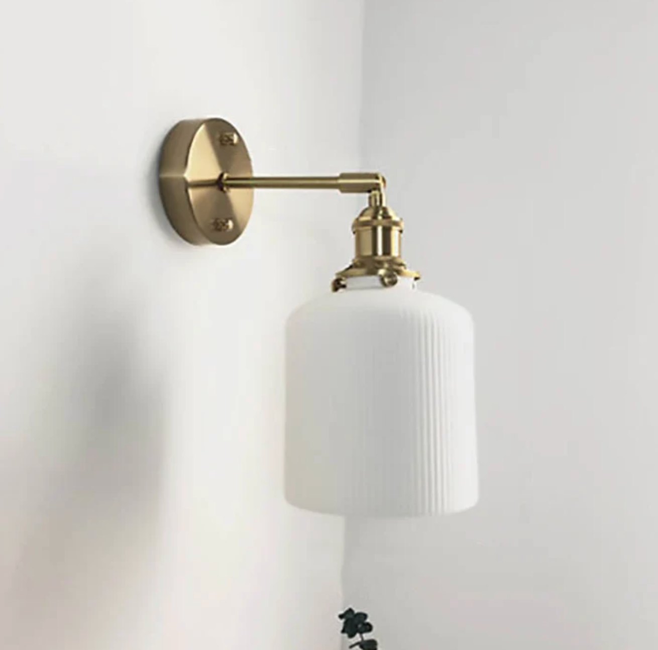 Elegancki kinkiet ścienny inspirowany stylem vintage, łączy ponadczasowy urok z nowoczesną funkcjonalnością. Mleczny, ryflowany klosz z białego szkła rozprasza światło, tworząc przytulną atmosferę, a detale w kolorze szczotkowanego mosiądzu dodają mu klasy i wyrafinowania. Różnorodne formy kloszy (kuliste, walcowate, owalne) pozwalają dopasować lampę do wnętrz w stylu klasycznym, retro, loft czy art déco.