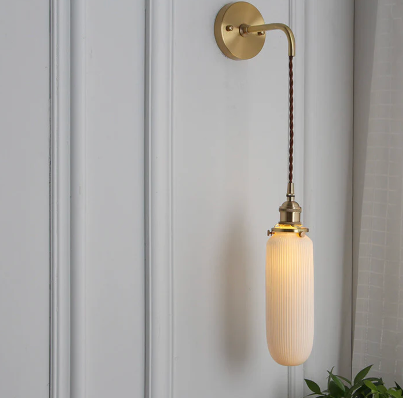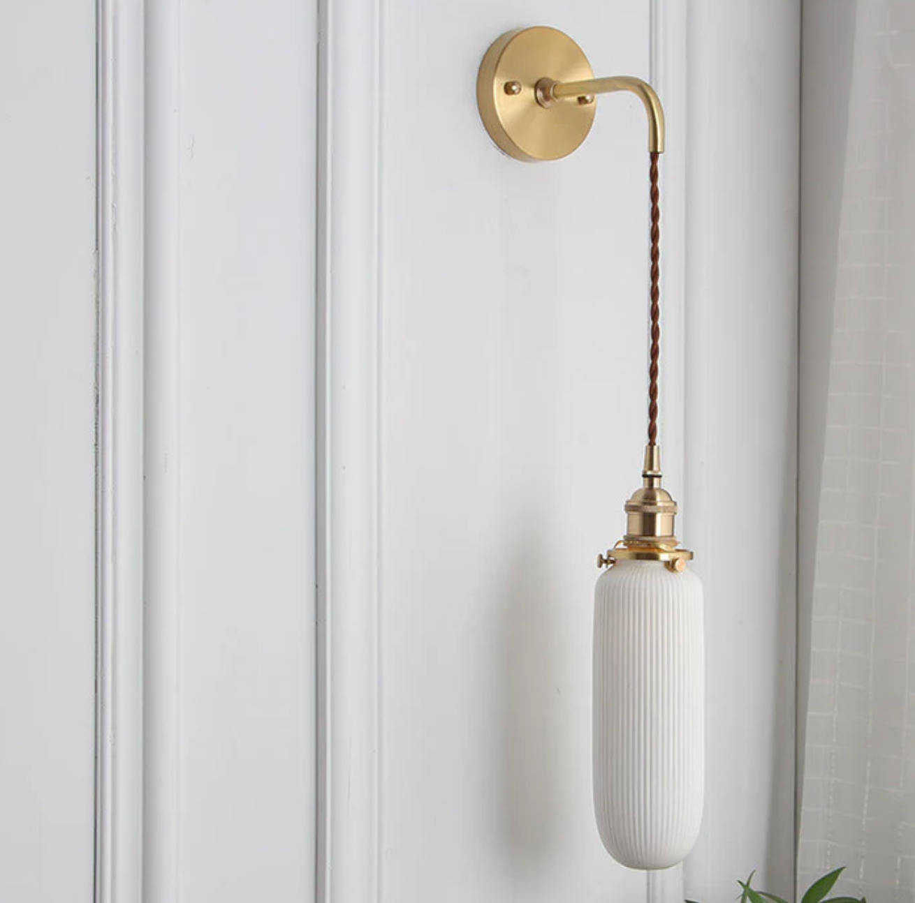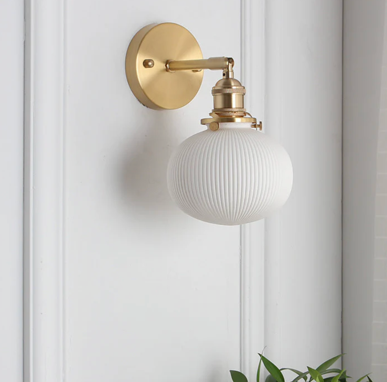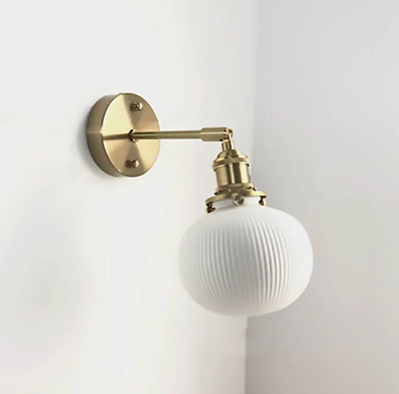 Elegancki kinkiet ścienny inspirowany stylem vintage, łączy ponadczasowy urok z nowoczesną funkcjonalnością. Mleczny, ryflowany klosz z białego szkła rozprasza światło, tworząc przytulną atmosferę, a detale w kolorze szczotkowanego mosiądzu dodają mu klasy i wyrafinowania. Różnorodne formy kloszy (kuliste, walcowate, owalne) pozwalają dopasować lampę do wnętrz w stylu klasycznym, retro, loft czy art déco.