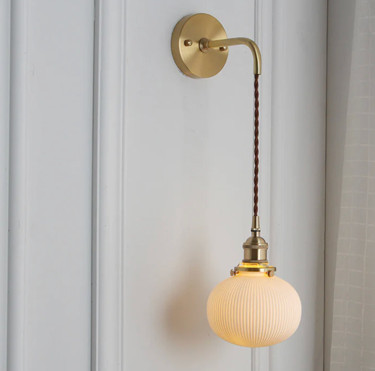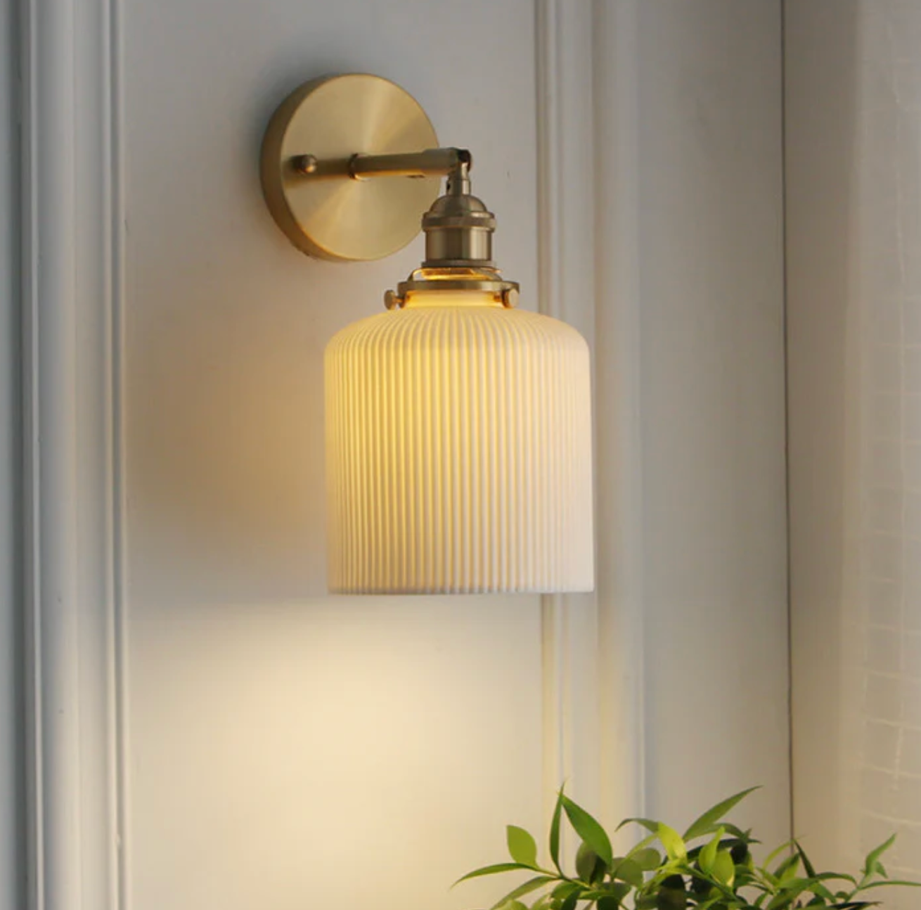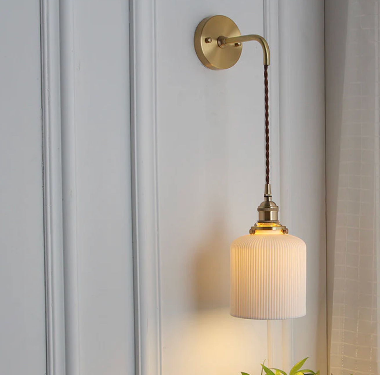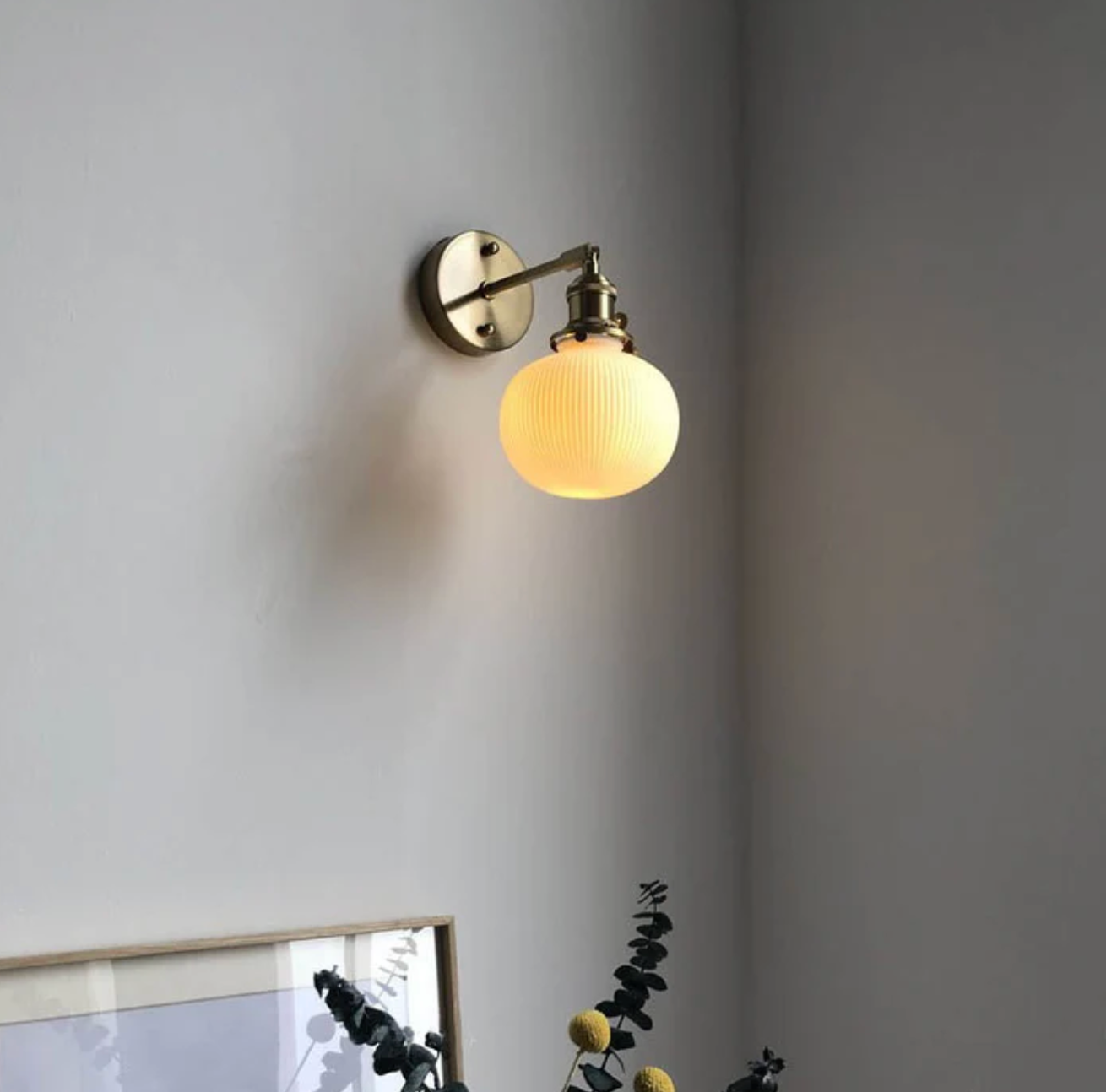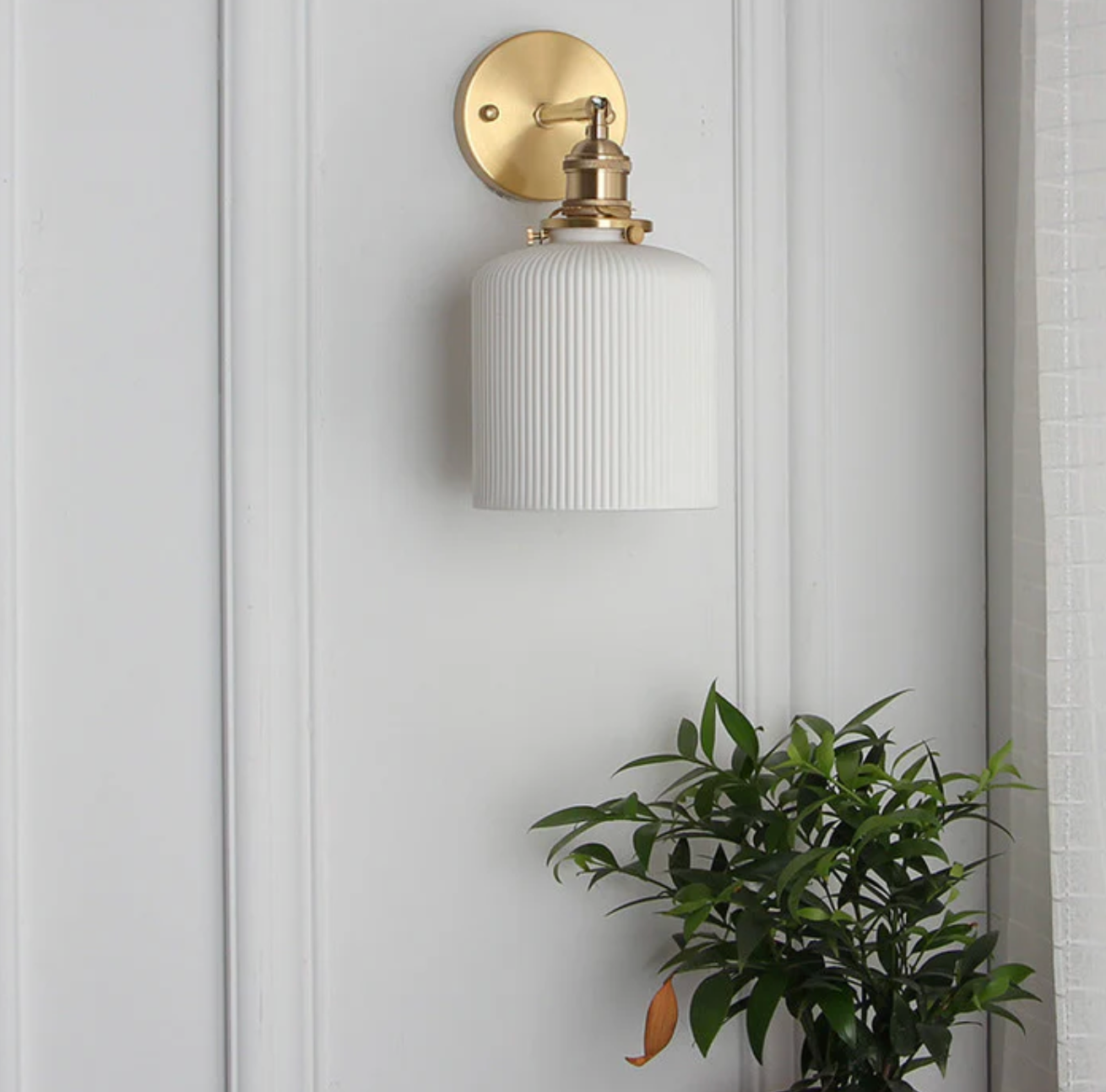 Elegancki kinkiet ścienny inspirowany stylem vintage, łączy ponadczasowy urok z nowoczesną funkcjonalnością. Mleczny, ryflowany klosz z białego szkła rozprasza światło, tworząc przytulną atmosferę, a detale w kolorze szczotkowanego mosiądzu dodają mu klasy i wyrafinowania. Różnorodne formy kloszy (kuliste, walcowate, owalne) pozwalają dopasować lampę do wnętrz w stylu klasycznym, retro, loft czy art déco.