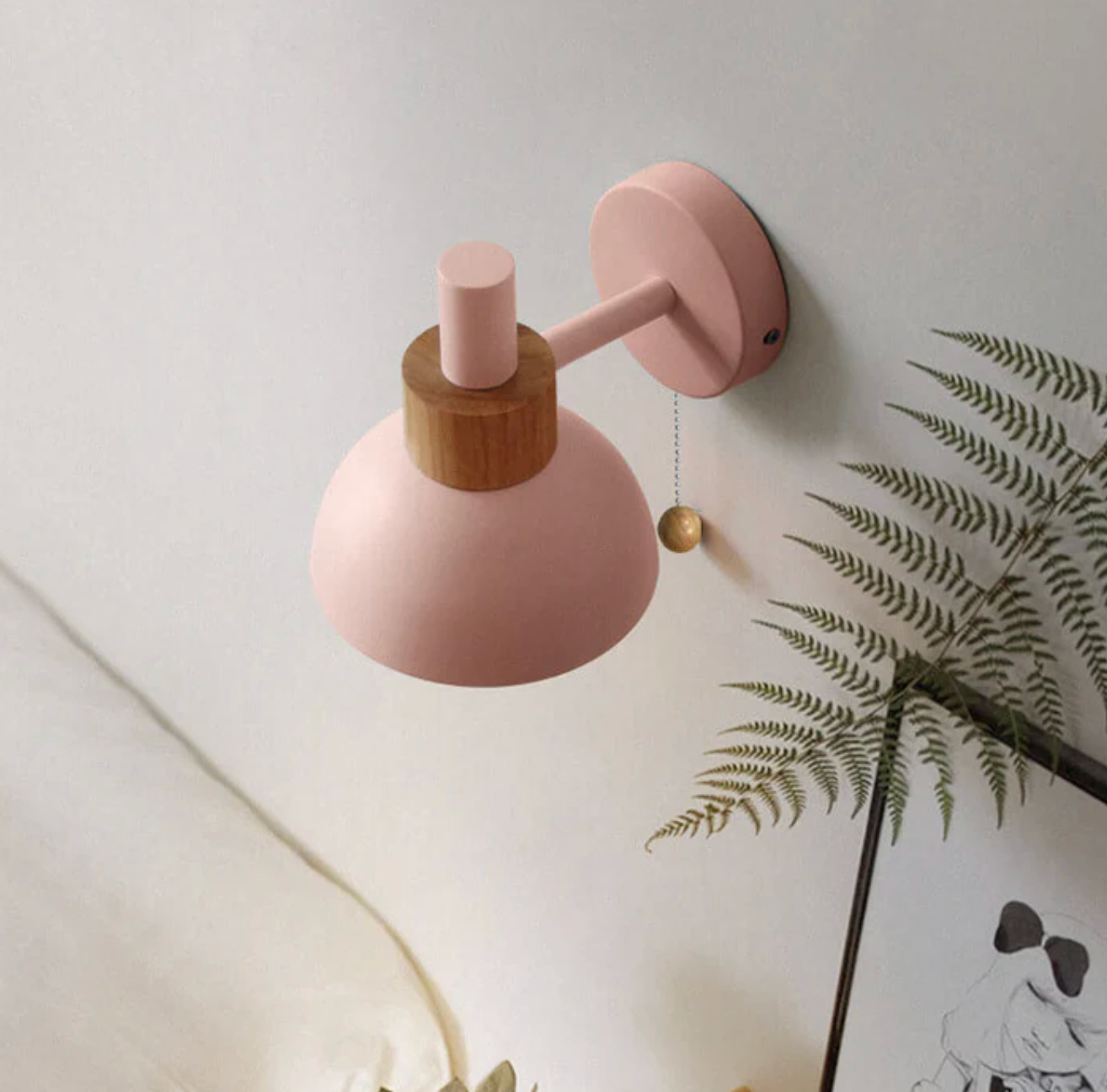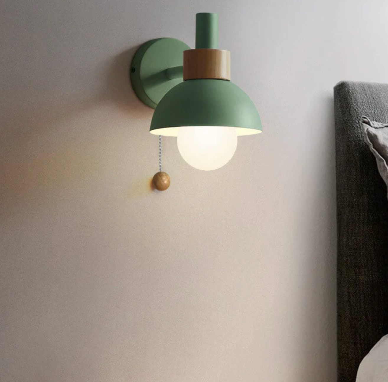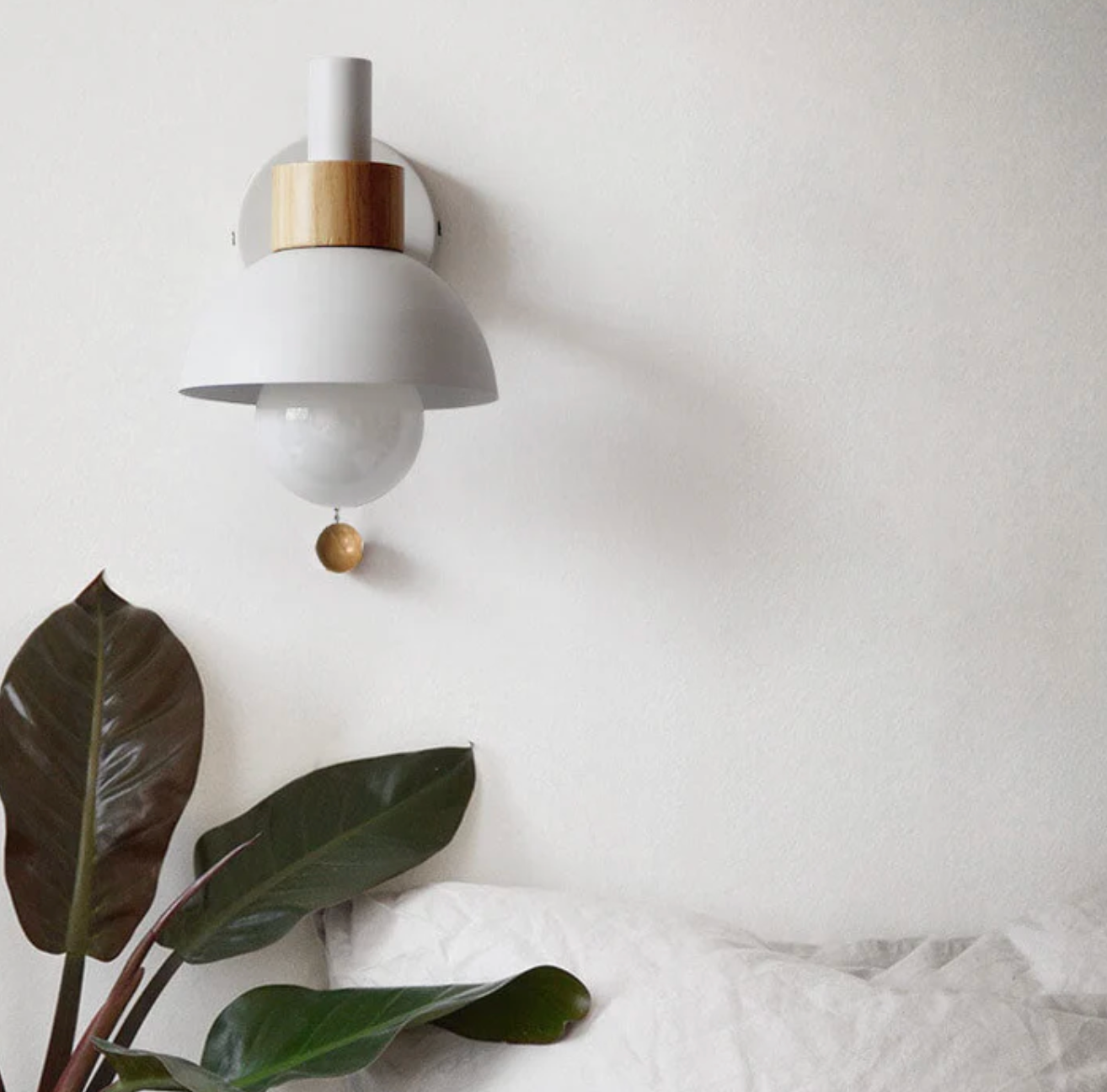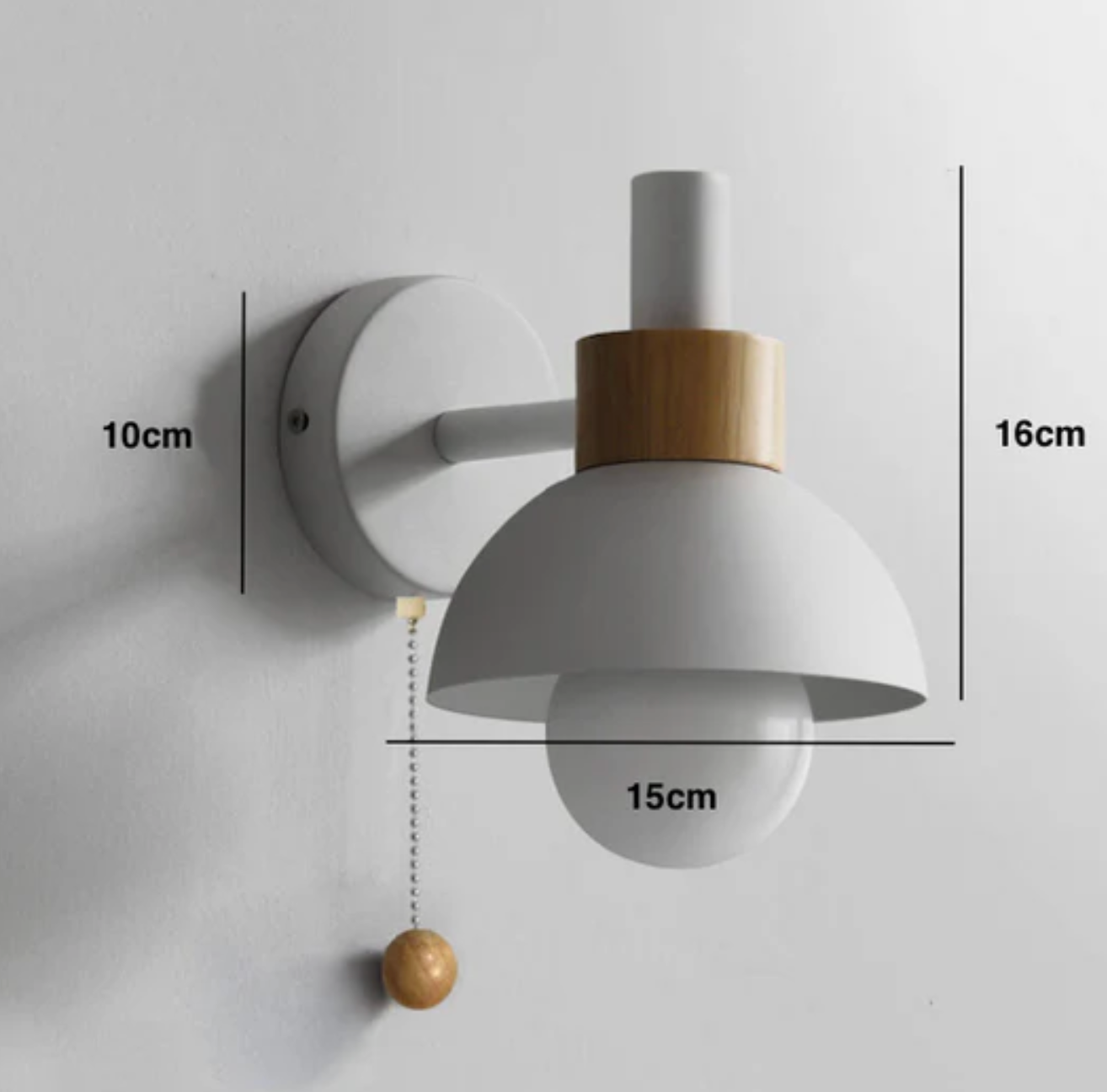 Stylowy kinkiet ścienny z dekoracyjnym łańcuszkiem to połączenie nowoczesnej formy i naturalnych detali. Półokrągły klosz w zestawieniu z drewnianym elementem tworzy harmonijną kompozycję, która doskonale sprawdzi się w sypialni, pokoju dziecka, korytarzu lub przy łóżku jako lampka nocna.