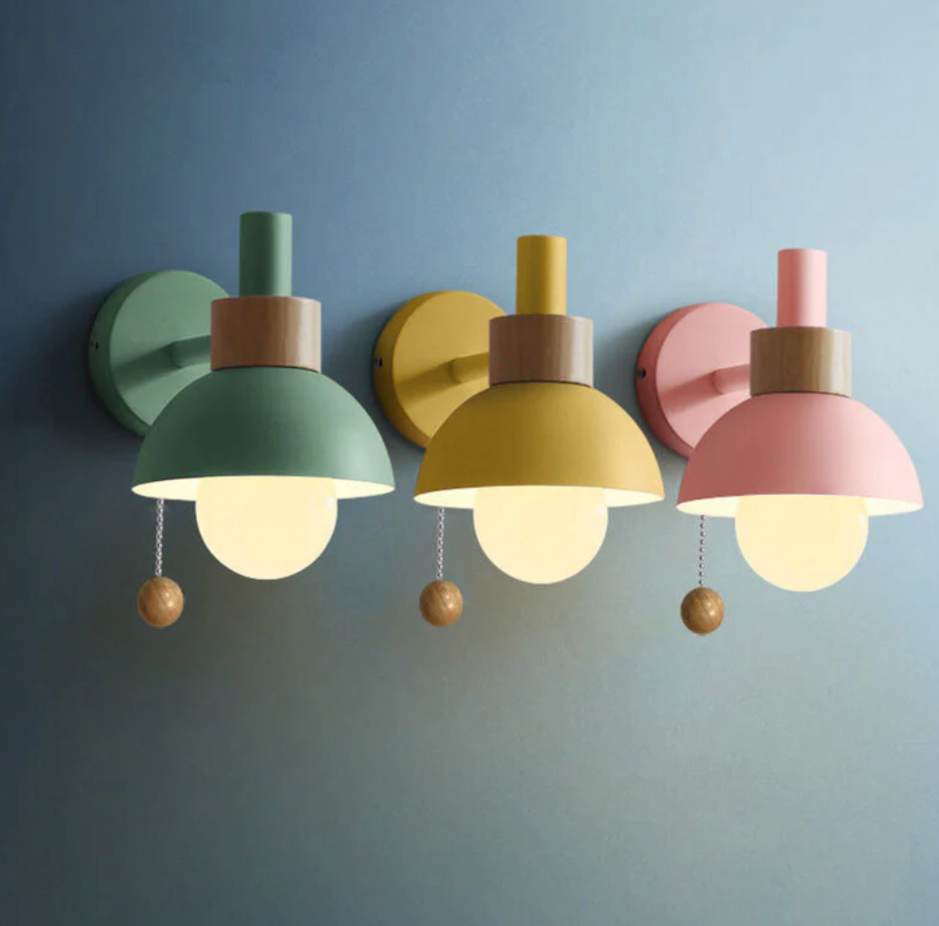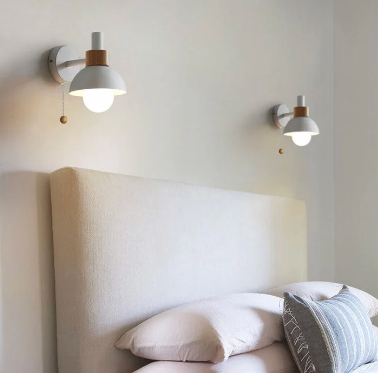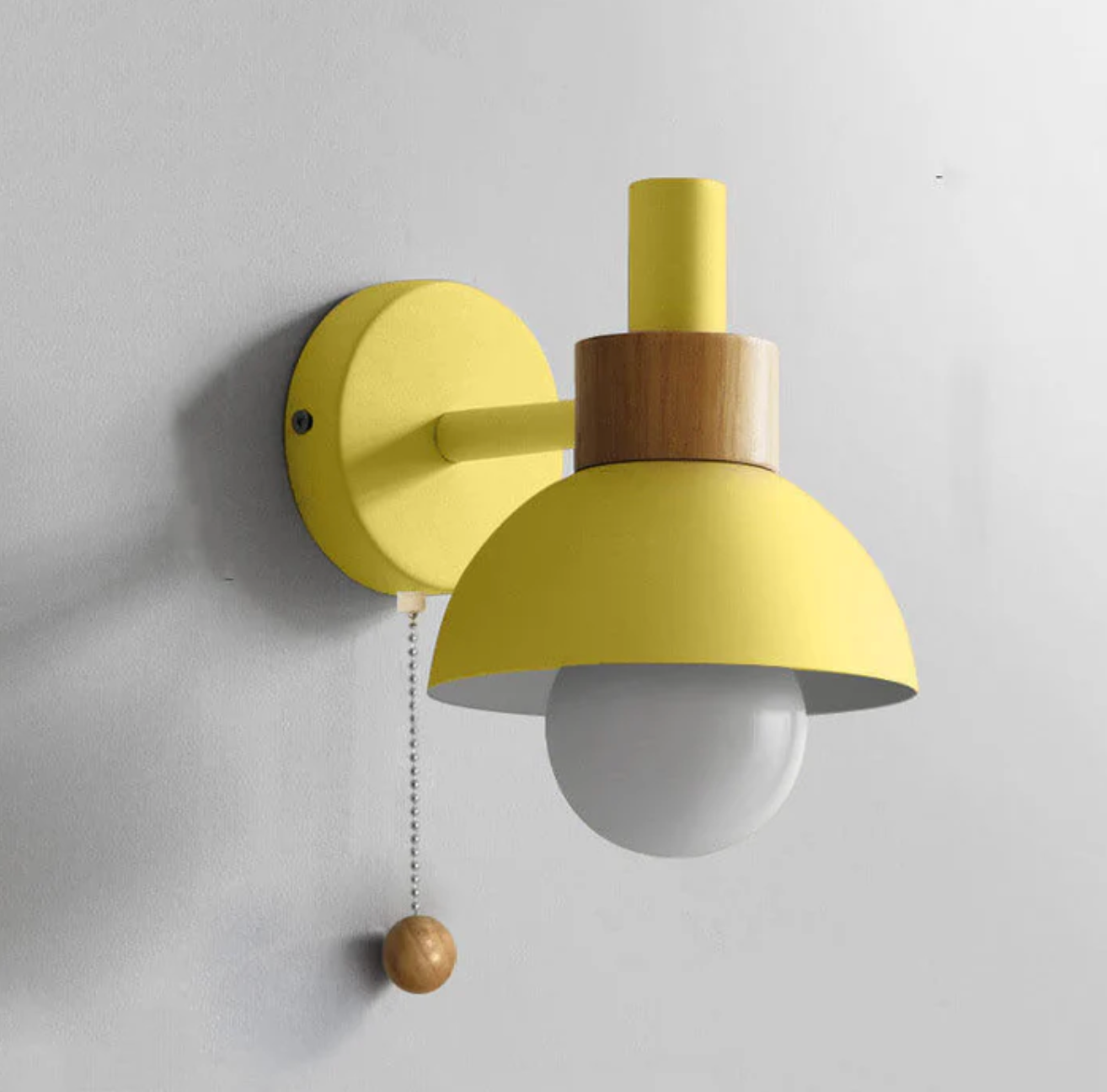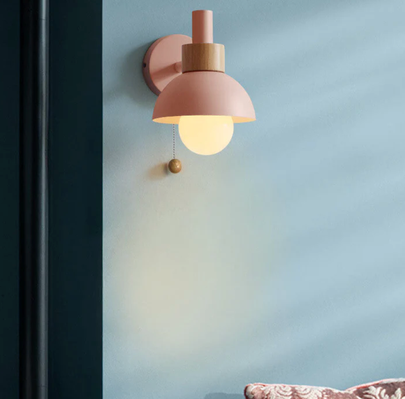 Stylowy kinkiet ścienny z dekoracyjnym łańcuszkiem to połączenie nowoczesnej formy i naturalnych detali. Półokrągły klosz w zestawieniu z drewnianym elementem tworzy harmonijną kompozycję, która doskonale sprawdzi się w sypialni, pokoju dziecka, korytarzu lub przy łóżku jako lampka nocna.