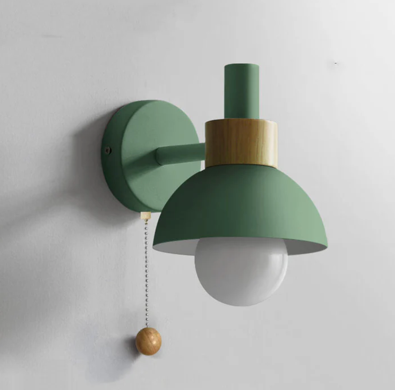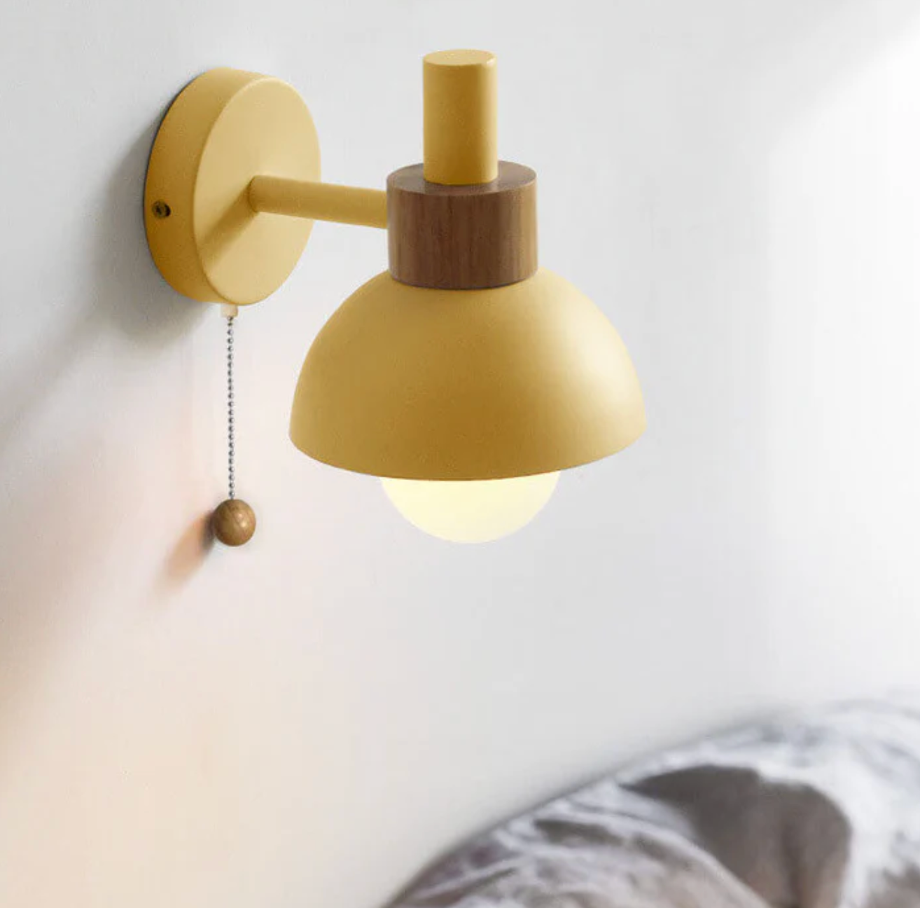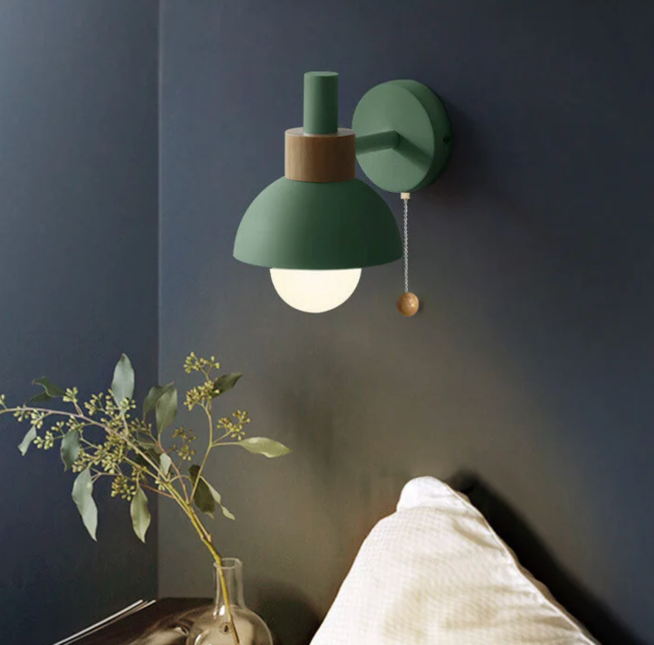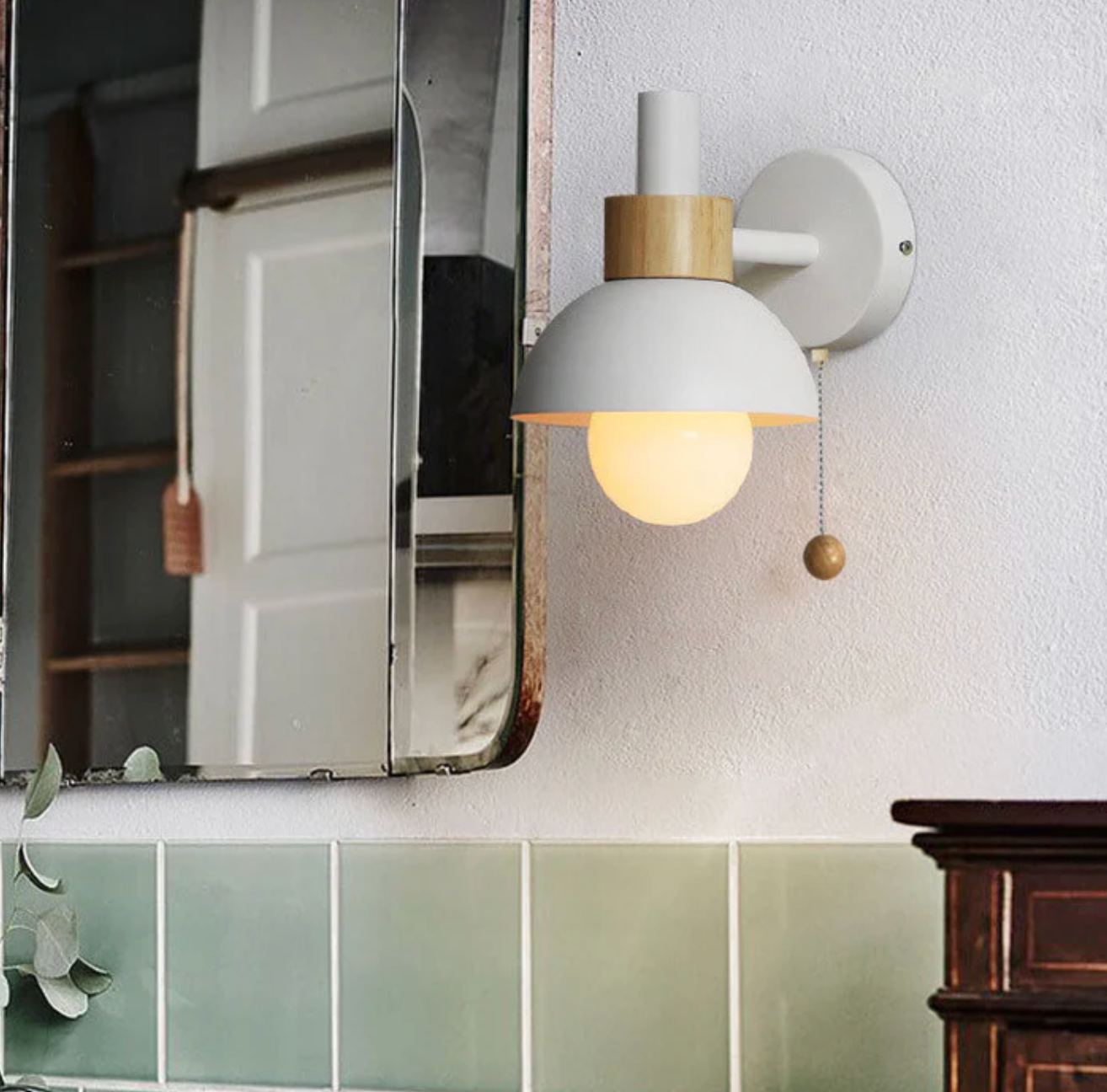 Kinkiet ścienny z łańcuszkiem – nowoczesna lampa ścienna z drewnianym akcentem