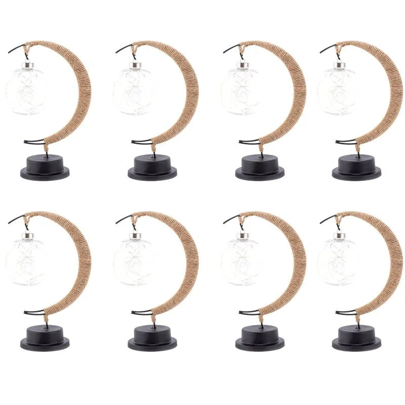 Urokliwa lampka stołowa LED w formie szklanej kuli pełnej świetlnych drucików, zawieszonej na dekoracyjnym półksiężycu owiniętym jutowym sznurkiem. Tworzy ciepłą i magiczną atmosferę, idealną do sypialni, salonu lub jako klimatyczne oświetlenie dekoracyjne. Doskonały wybór dla miłośników przytulnych wnętrz i oryginalnych dodatków.