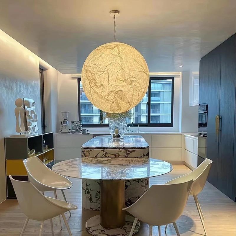 Designerska lampa wisząca w formie dużej kuli o subtelnej, dekoracyjnej fakturze. Jej delikatnie zdobiona powierzchnia przypomina naturalne wzory, które pięknie rozpraszają światło, tworząc miękką i przyjemną atmosferę w pomieszczeniu. Dzięki swojej prostej, a zarazem efektownej formie, lampa idealnie sprawdzi się w salonie, jadalni, sypialni czy przestrzeni komercyjnej, podkreślając charakter wnętrza. To połączenie minimalizmu, elegancji i nowoczesnego designu.
