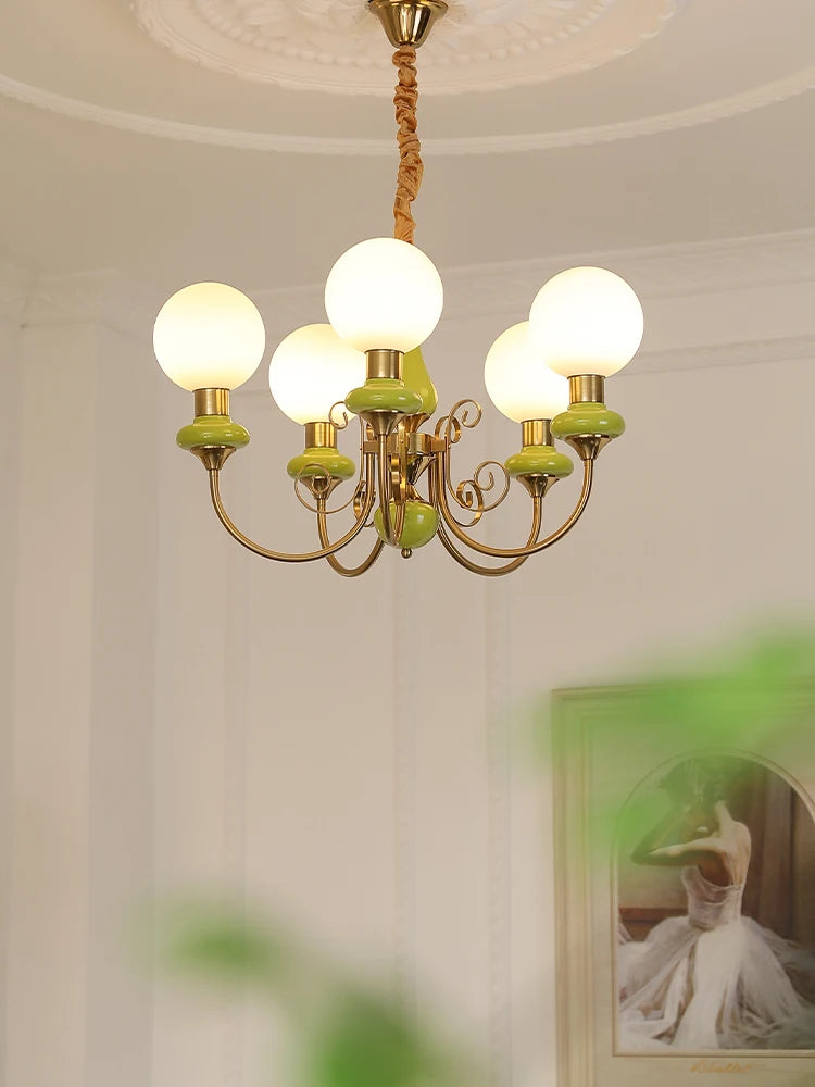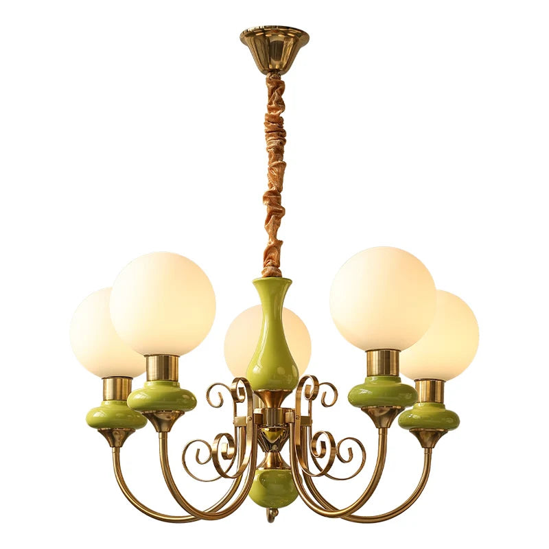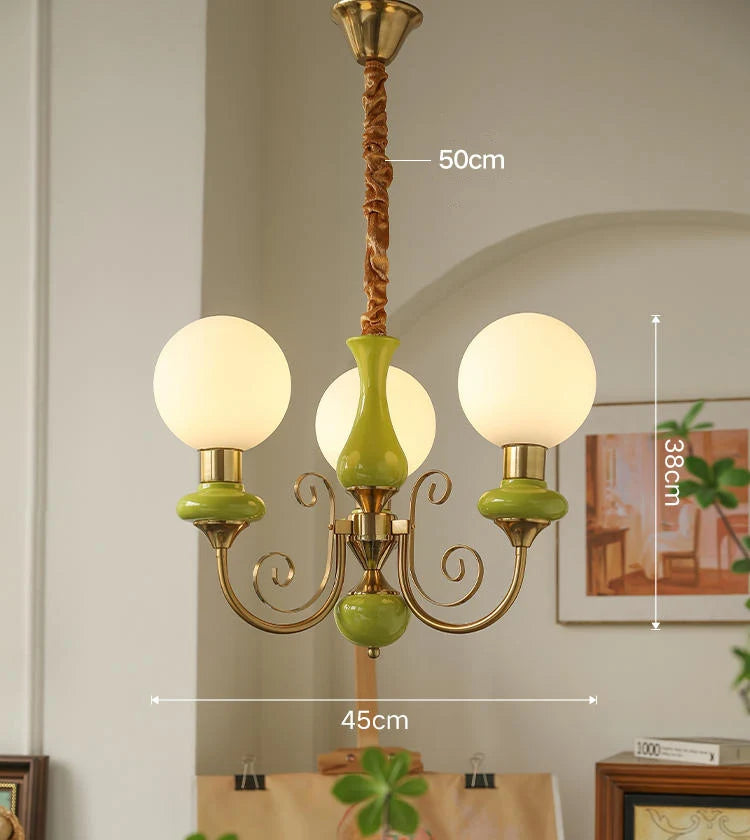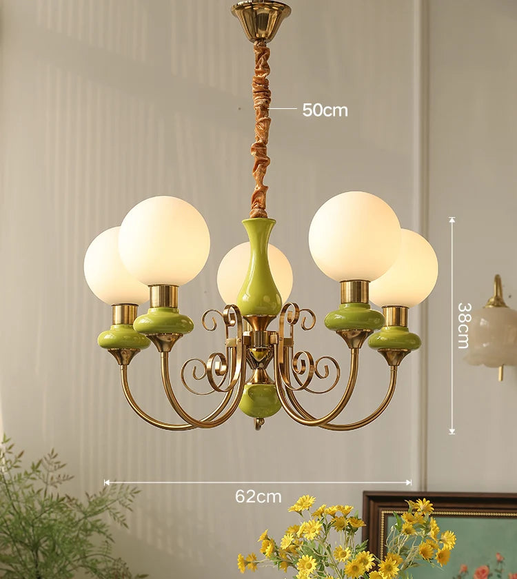 Stylowy żyrandol retro, który łączy klasyczną elegancję z nowoczesnym akcentem w postaci zielonych detali. Klosze w formie kul z mlecznego szkła dają przyjemne, miękkie światło, tworząc ciepłą i przytulną atmosferę w pomieszczeniu.